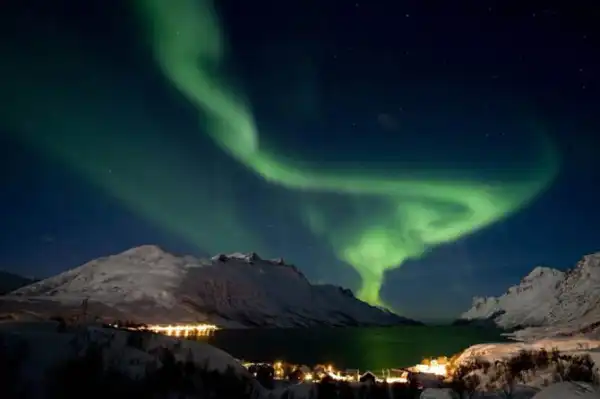 Световое шоу. Северные огни сияют над Норвегией ночью 21-го февраля. Такое рассветное явление вызвано взаимодействием между заряженными частицами с Солнца и молекулами газа в верхних слоях атмосферы Земли.
