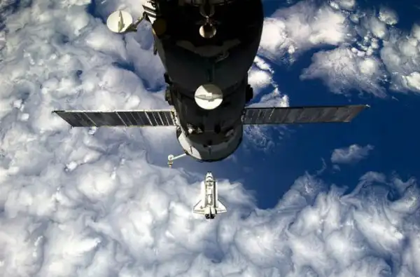 Приближаясь. На фоне белых облаков и водных просторов Земли мы видим космический шаттл Дискавери, который в последний раз готовится к стыковке с МКС. На этой фотографии, сделанной 26-го февраля членом экипажа МКС, мы видим российский корабль «Прогресс», состыкованный с Международной космической станцией, который словно указывает на шаттл.