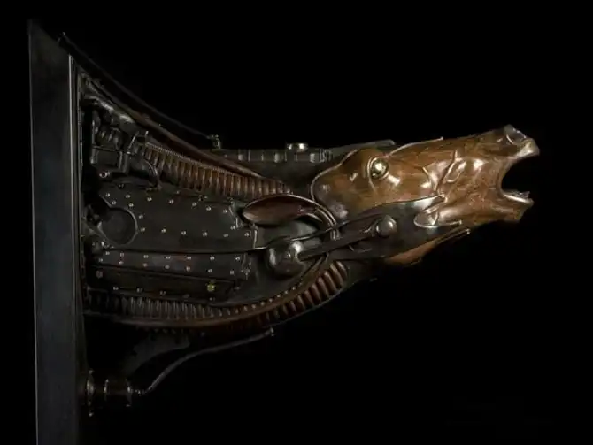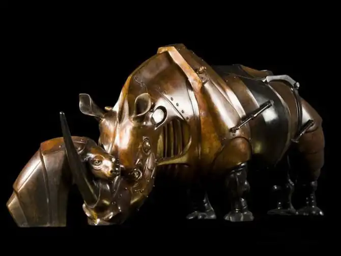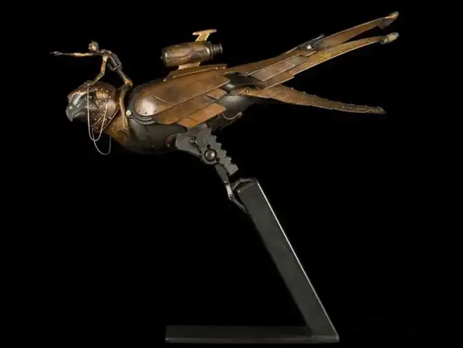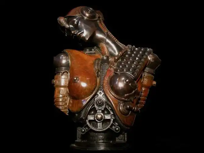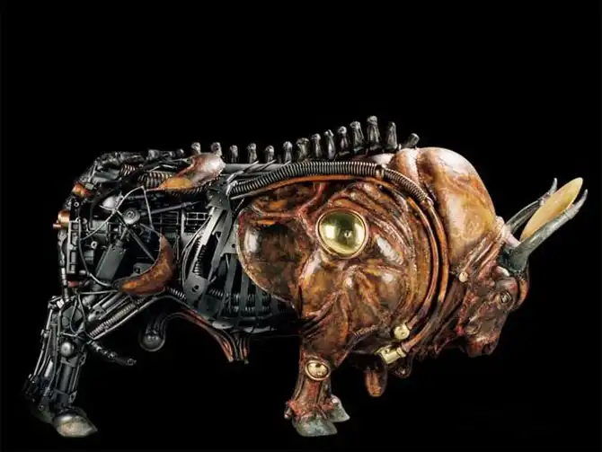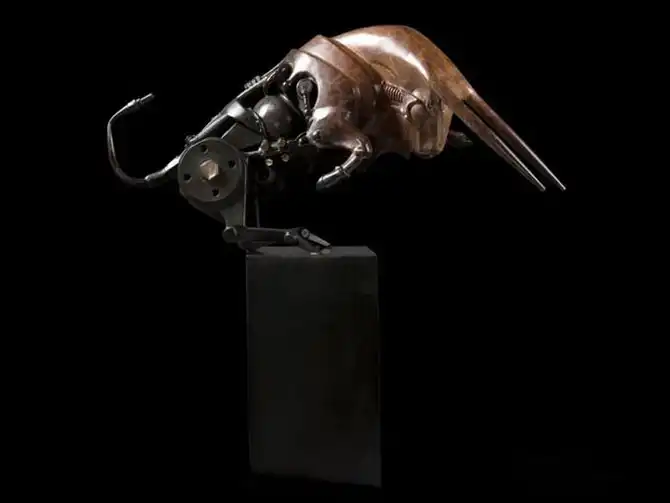 Все свои удивительные стимпанковые скульптуры Пьер Маттер создает уже больше десяти лет в своем гараже, используя такой материал, как медь, алюминий, резина, а также другие подручные средства. Некоторые скульптурные работы киборгов французского мастера, являясь комбинированным художественным выражением природного мира и технической цивилизации, могут весить больше 1,5 тонны.