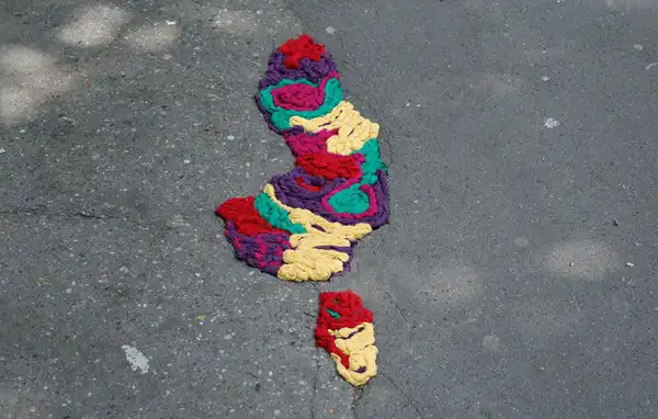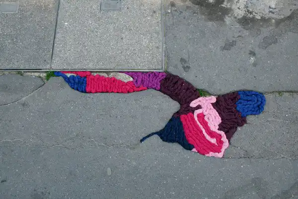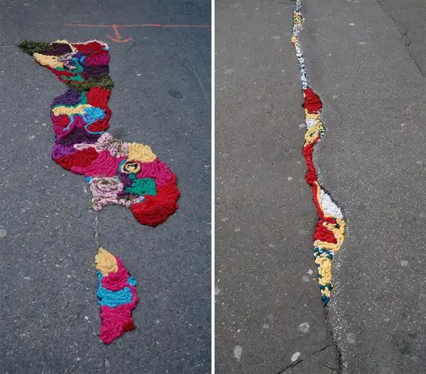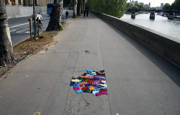Джулиана Сантакруз Херрера (Juliana Santacruz Herrera) решила, что улицы Парижа слишком мрачные и нуждаются во вмешательстве со стороны художника. Она придумала украсить выбоины в асфальте, используя красочные полоски ткани. Это не обычный стрит-арт, а целые уличные аппликации!