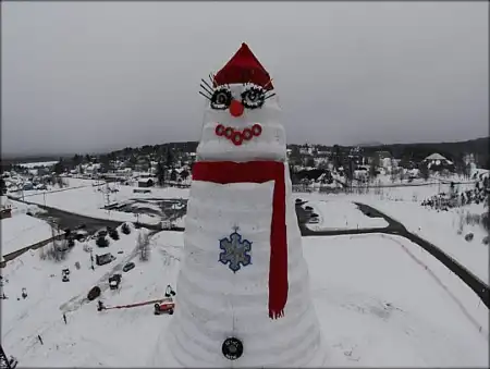Этот снеговик, которого вы видите на фото, был создан стараниями жителей города Бетель, что в штате Мэн, США. Высота его целых 37 метров, а руками служат среднего размера деревья. Создатели снеговика - монстра дали ему имя "Олимпия". Вероятно, рекорд не скоро кто-нибудь сможет побить, все же целых 37 метров в высоту, это вам не снежную бабу из отдельных шаров снега создавать.