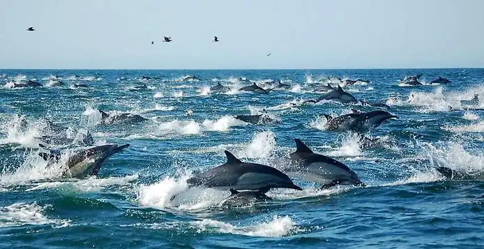 Резвящаяся неподалёку стайка дельфинов