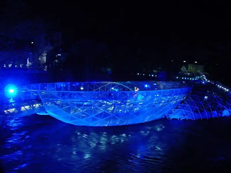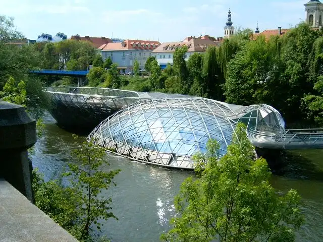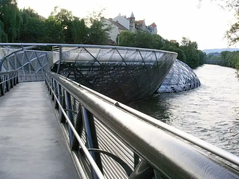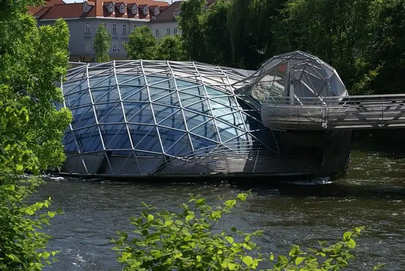 Австрийский город Грац является вторым по значению после столицы. Популярность и известность городу принес Арнольд Шварцнеггер, который здесь родился. Но многие покупают туры в Австрию, чтобы посетить необычный мост, соединяющий два берега реки Мур. Если быть более точным, это не просто мост, а мост с "островом" посередине реки (отсюда название - Aiola Island). Этот шедевр современной архитектуры был построен в 2003 году, и это идеальное место, где можно спрятаться от внезапного дождя, к тому же, на мосту может находиться до 350 человек одновременно. Своим появлением он обязан архитектору из Нью-Йорка Вито Акконси. "Мы хотели создать место, которое визуально будет разделено на две определенных зоны, и эти зоны должны постепенно сливаться в одно единое целое" - объясняет Вито Акконси.