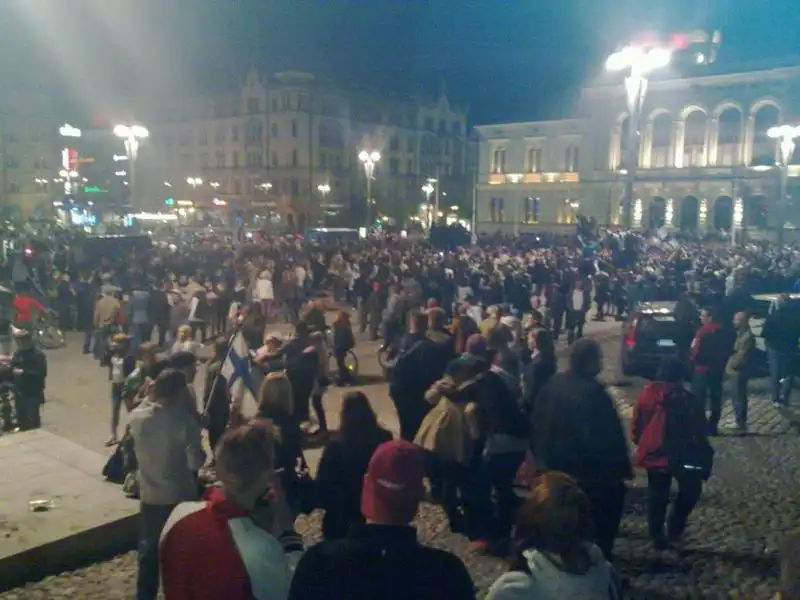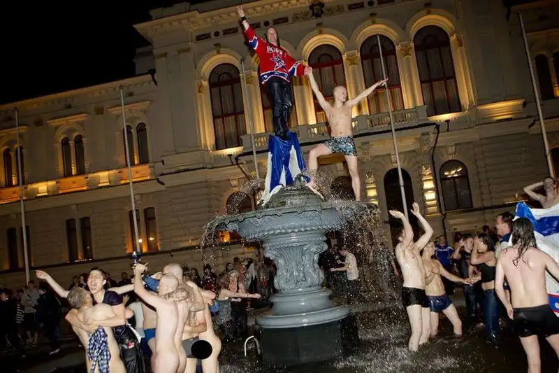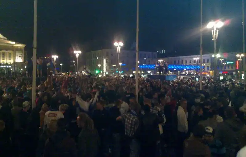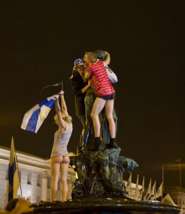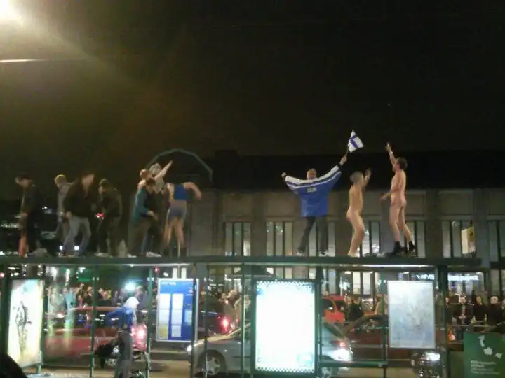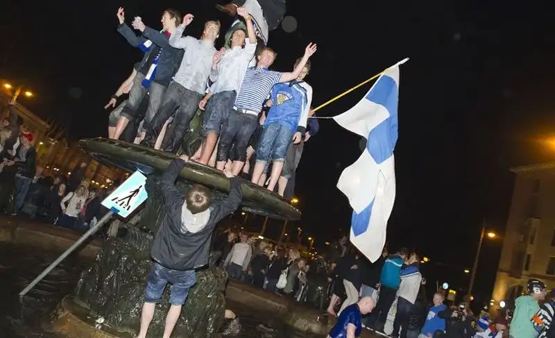 Моралистам и ханжам предлагается посмотреть кадры неистовства спокойных, вежливых и мирных финских болельщиков, отмечающих победу своей сборной в чемпионате. Взгляните на эти милые, добрые лица и их добродушное человеколюбивое поведение.
