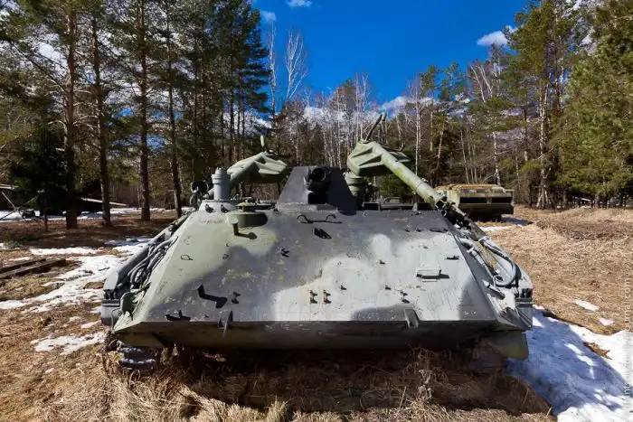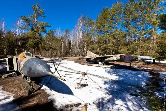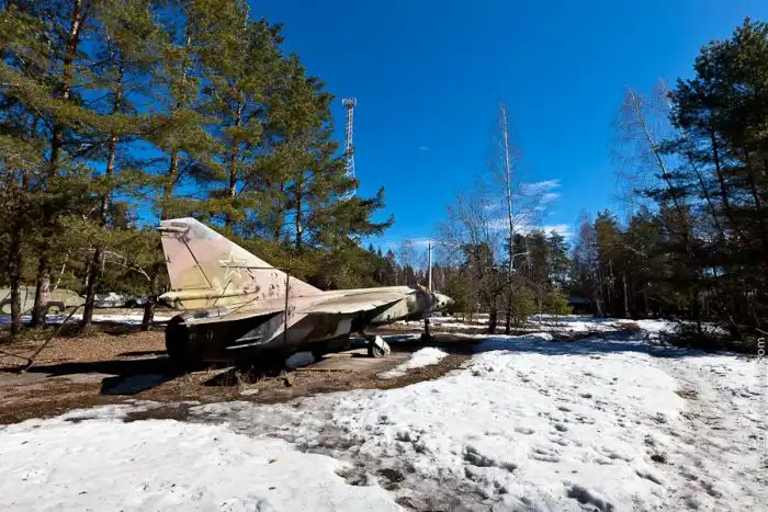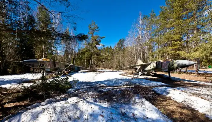 В глухом подмосковном лесу нашли военную базу, которая скорее всего служила для тренировки солдат. На поляне стоит два самолета Миг-23, передвижной мост, который помогал другой крупной технике преодолевать препятствия, несколько фанерных макетов военных машин и даже памятник в честь запуска первых жидкостных ракет.