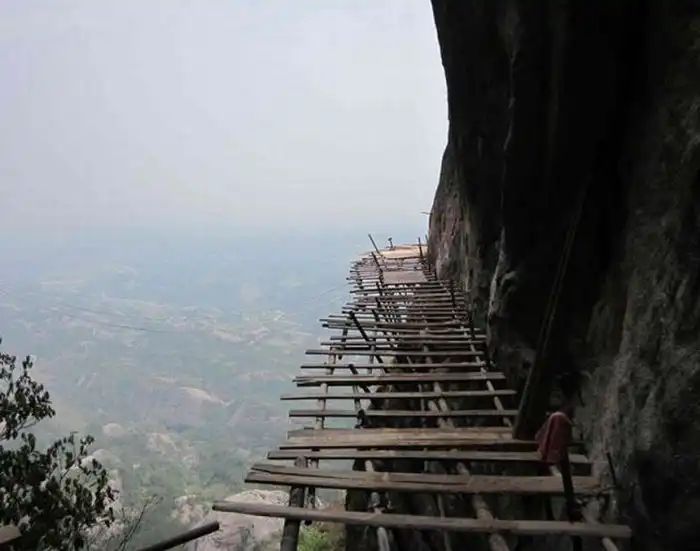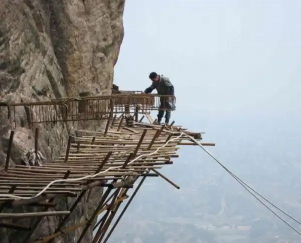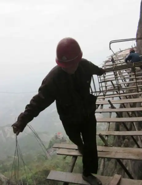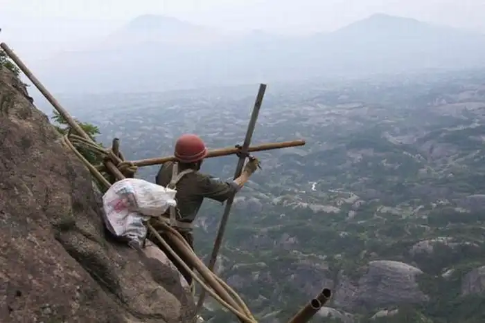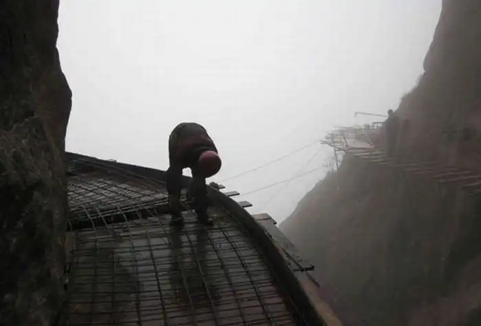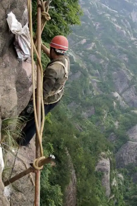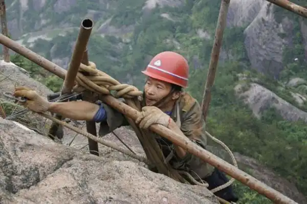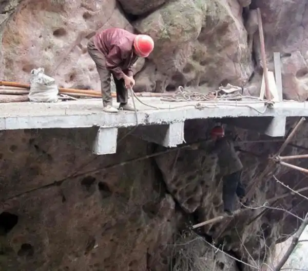 Китайские рабочие строят путь, огибающий горы. Работа очень опасная и страшная, самое удивительное, что они работают без страховки, только каска, которая ничем не поможет при падении. Видимо они об этом стараются не думать, а все силы вкладывают в строительство, молодцы все-таки они.
