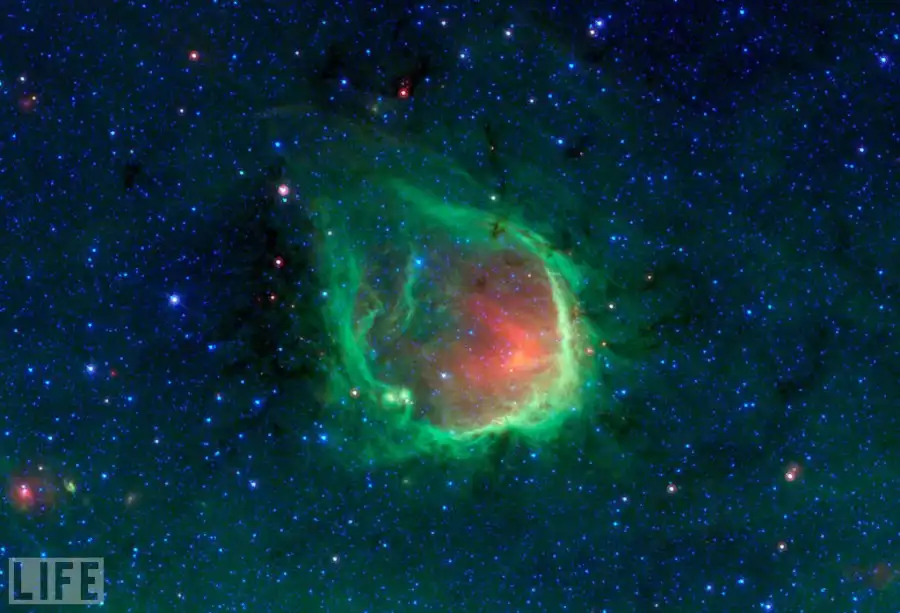 Это светящаяся изумрудно-зеленым туманность, фотография которой была сделана с помощью космического телескопа Спитцера, принадлежащего НАСА, напоминает светящиеся кольца супергероя Зеленого Фонаря. Астрономы считают, что кольца, подобные этому, на самом деле обязаны своим появлением мощному свету гигантских звезд О, самых массивных звезд, о существовании которых известно астрономической науке.