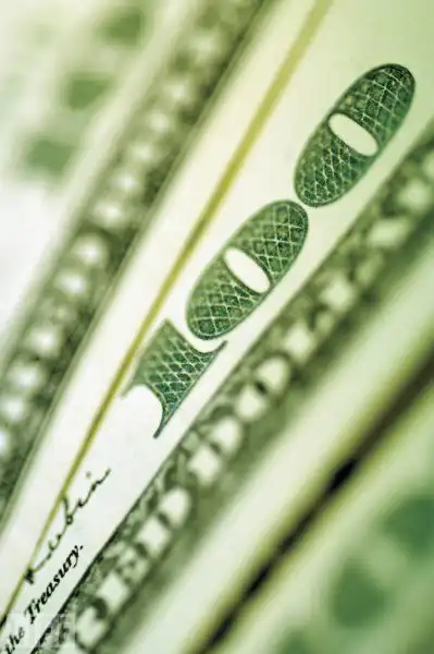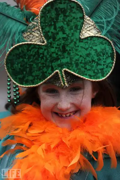 Участница парада в День Святого Патрика с головным убором в форме традиционного зеленого трилистника.