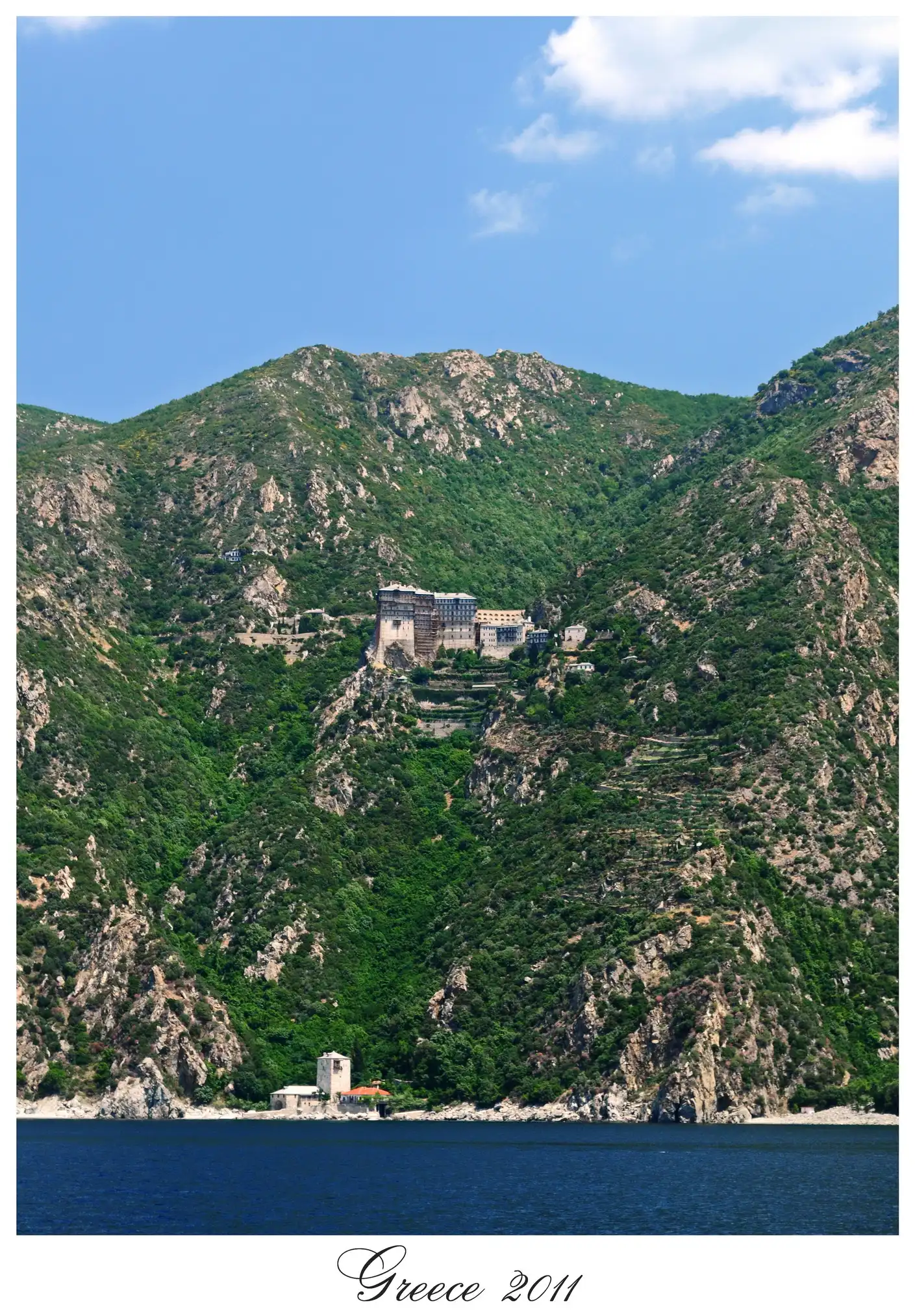 А вот и сам монастырь Св. Пантелеимона.Монасты́рь свято́го Пантелеи́мона на Афоне также известен как Ро́ссикон или Но́вый Ру́ссик — один из 20-и «правящих» монастырей на Святой Горе Афон в Греции. Традиционно считается «русским», хотя по составу насельников стал вполне русским лишь в последней четверти XIX века, когда перешёл под фактический контроль Российской Церкви и российского правительства (вплоть до начала Первой мировой войны). Как и все прочие афонские монастыри, будучи патриаршей ставропигией, находится в прямой канонической юрисдикции Константинопольского Патриархата; насельники, по действующей с 1924 года Уставной Хартии Святой Горы, обязаны принимать гражданство Греческой Республики (даётся автоматически при поступлении в монастырь). В настоящее время занимает 19-е место в иерархии святогорских обителей.