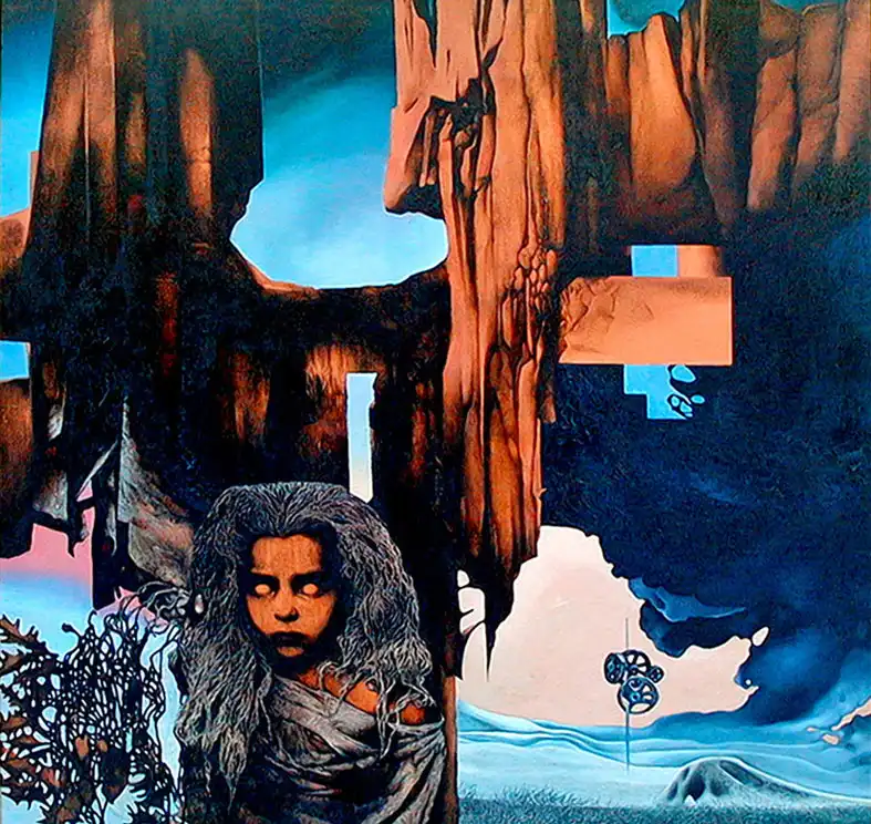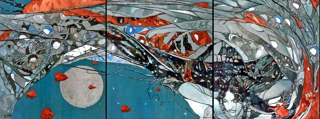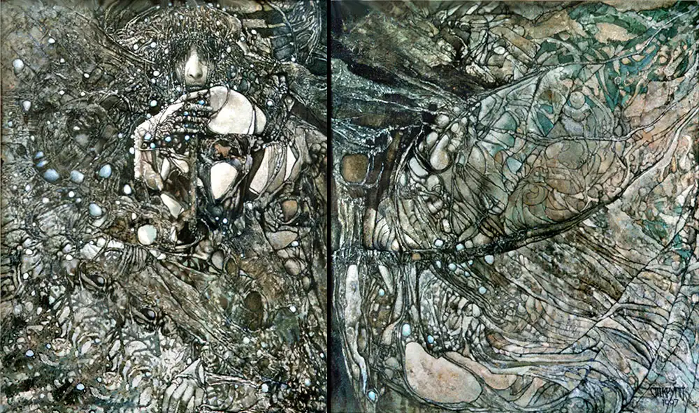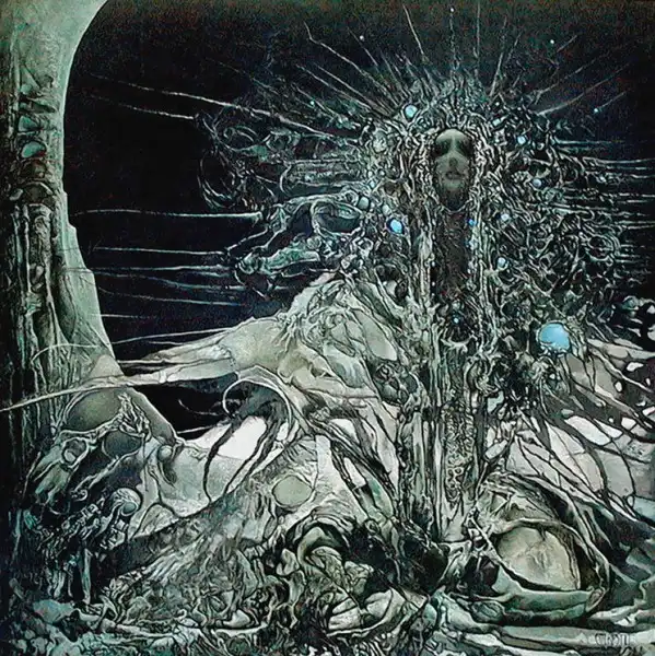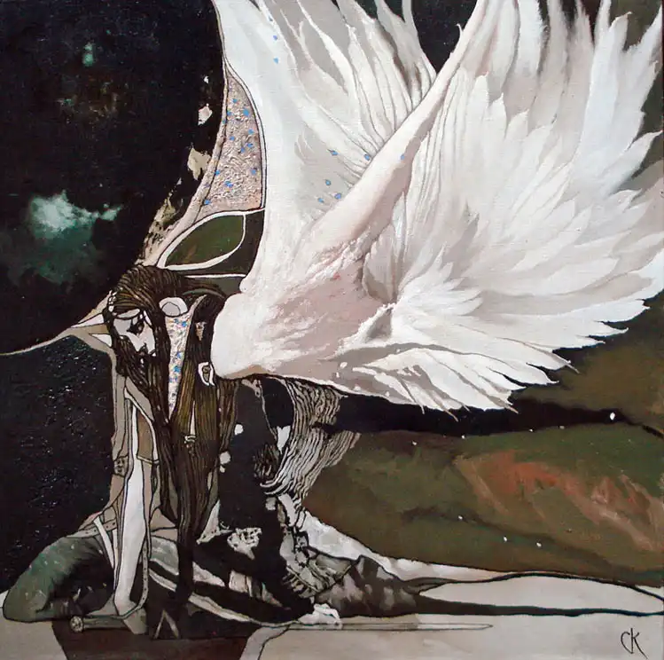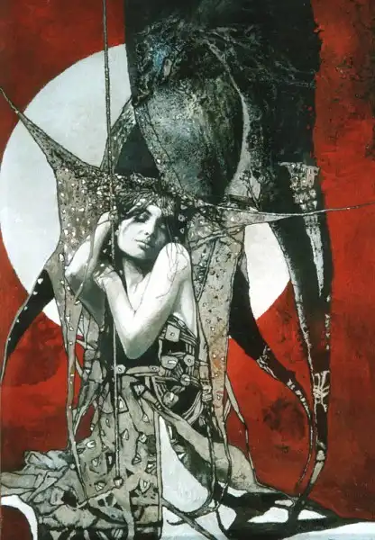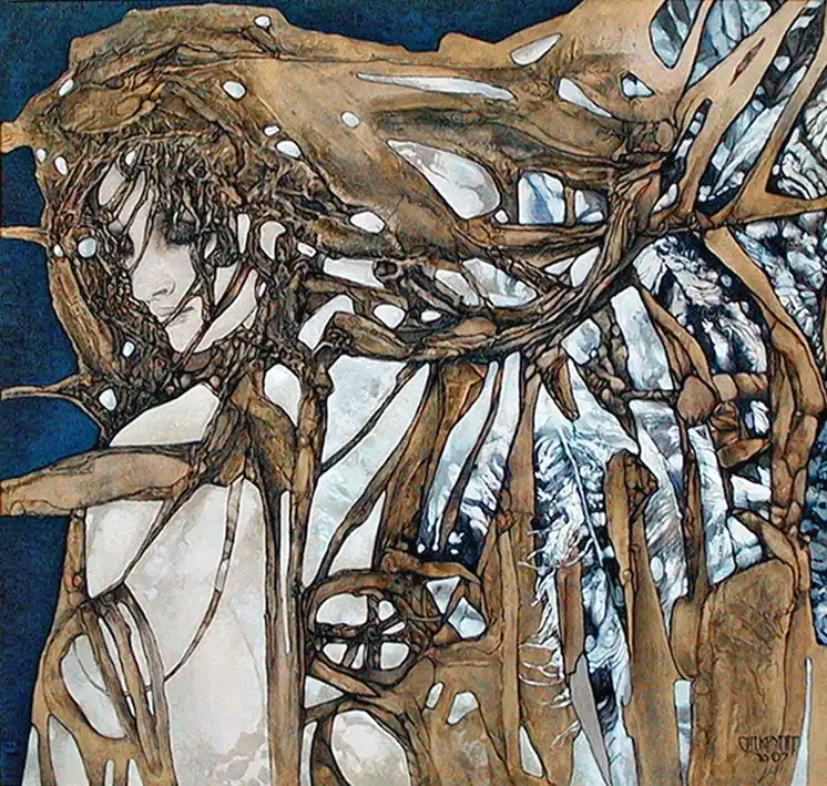 Спокойный человек чуть устало закрыл глаза. Он держится за нить, спускающуюся с неба. Сзади маячит совершенно непонятный, явно далекий от человеческого мира предмет (или существо?). И один из его отростков почти незаметно переходит в одеяние человека, окутывает его тело. Так же как и нить с неба — она тоже то ли переходит в одежду, то ли наоборот — прокалывает ее насквозь...