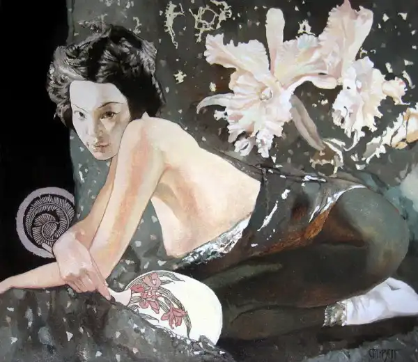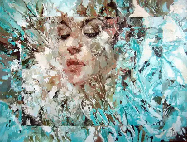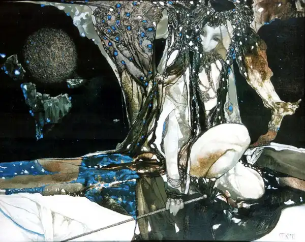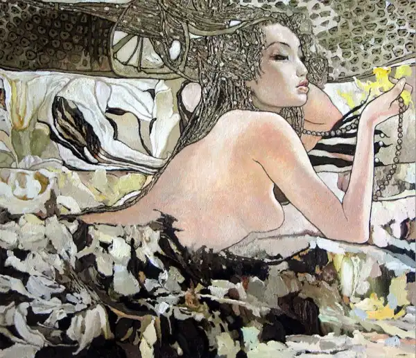 А юное, гибкое тело женщины лежит на ткани. Или – парит над ней? Главное – что сзади, за спиной, есть окно в огромный мир, окно в небо… Это окно все больше и больше врастает в ткань, на которой спит тело. И небо, как вода, размывает тоненькими струйками ткань – или, говоря по-другому, материю…