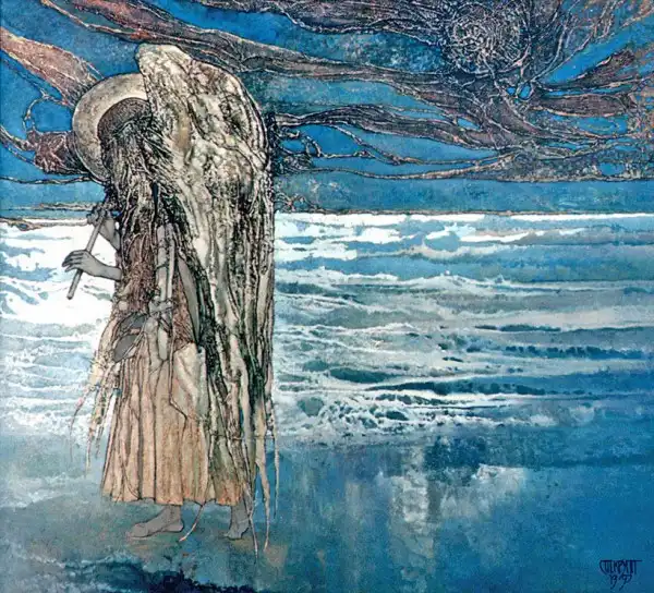 Море несет обрывки пены – воды, которая пытается, но не может подняться в воздух и оседает на берег промозглой капелью. Не так ли оседают вниз и многие души?.. В небе – огромный серп Луны. Кажется, что она падает вниз, готовится утонуть в огромной водной утробе… Впереди ангела – темные тучи. В чьем они будущем – только ли в человечьем? А может быть, ужас этого урагана – на двоих? Ангел ведь еще любит – и будет знать, видеть, как гибнет человек… И впервые ничего не сможет сделать для него…