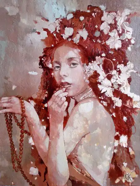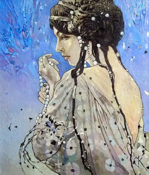 Переселение душ. Как здесь все непонятно для большинства людей... В руках чуть улыбающейся девушки зажаты бусы. Или четки?