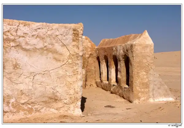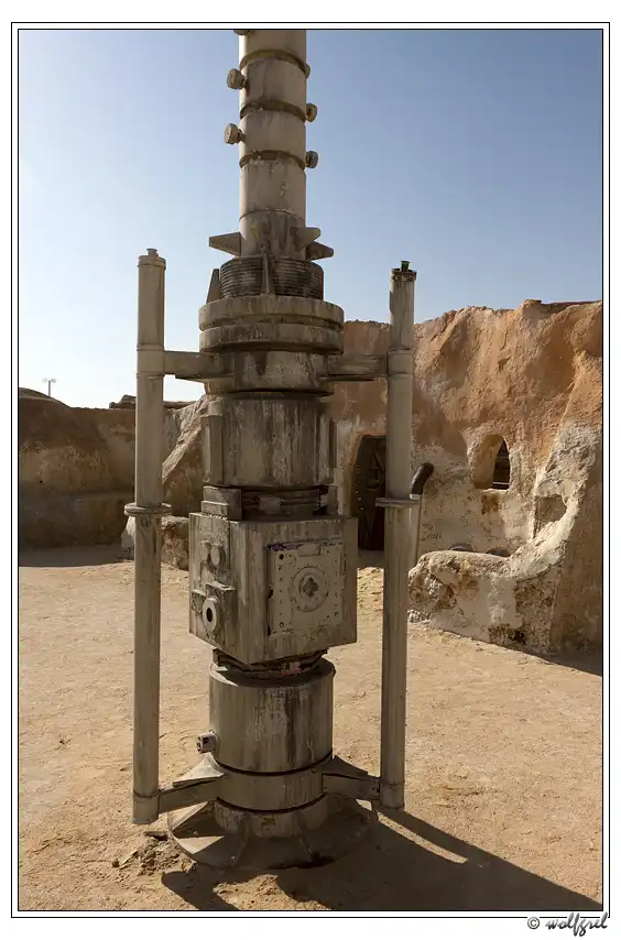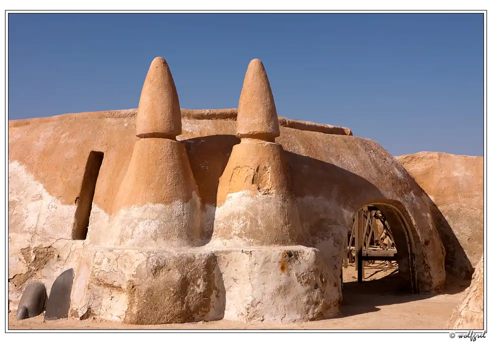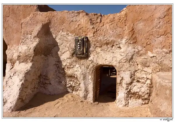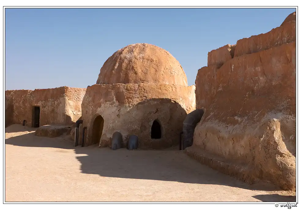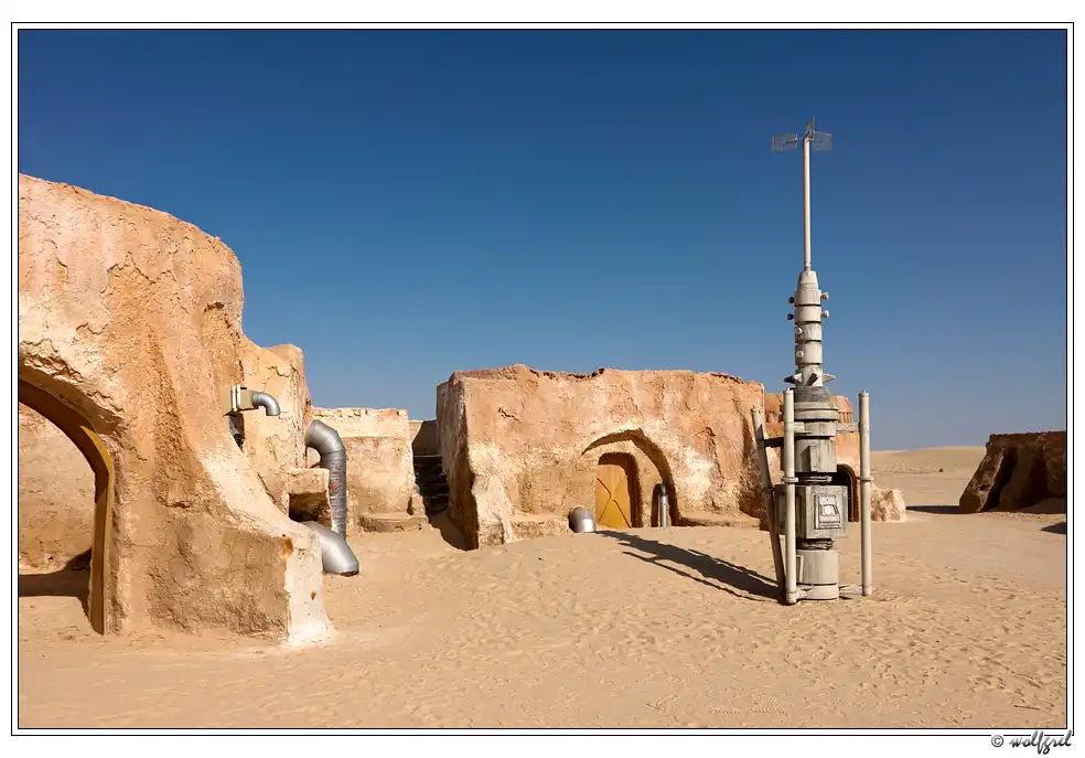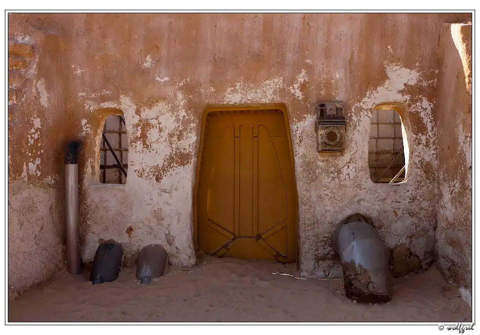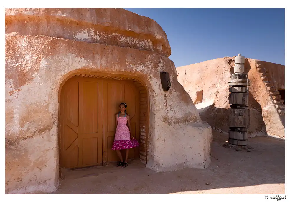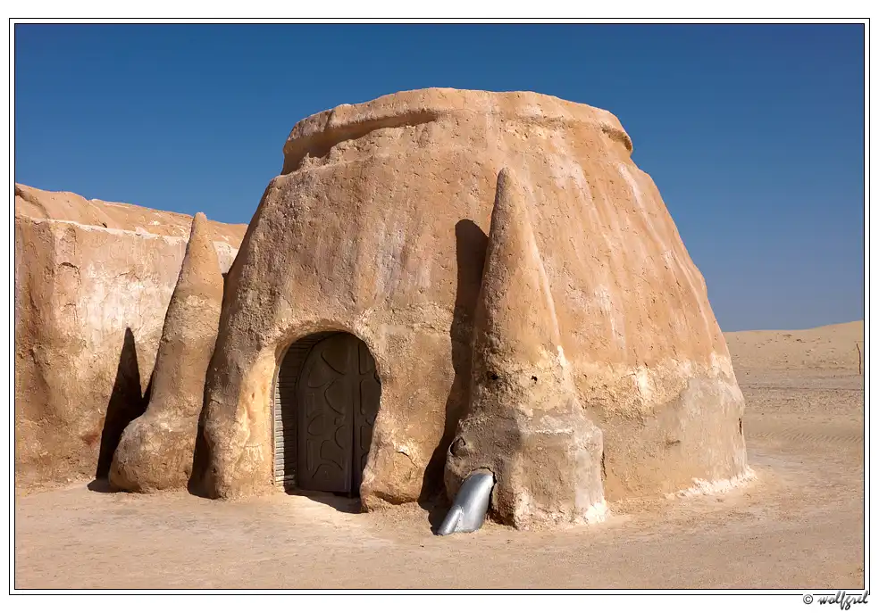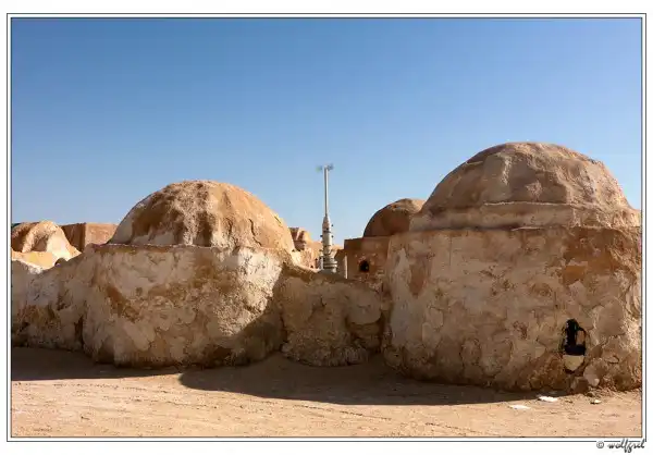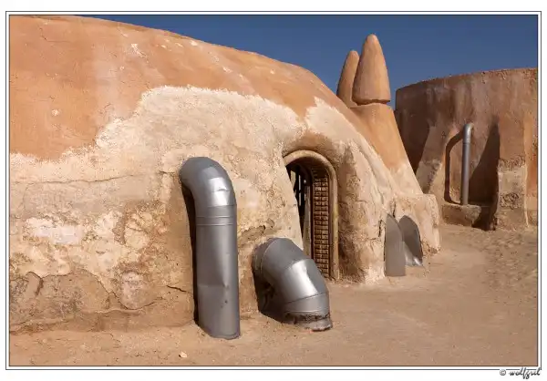 А декорации городка будущего джедая были выстроены Лукасом в песчаных холмах близ города Нефта в 15ти километрах от алжирской границы (посмотреть на карте). Засушливый климат позволил им сохраниться, практически, нетронутыми за 35 лет. Ясное дело, что будучи в Тунисе, и не увидеть такое – ну просто нельзя. Особенно, когда едешь с ребенком, перед поездкой просмотревшим все шесть эпизодов «Звездных войн».