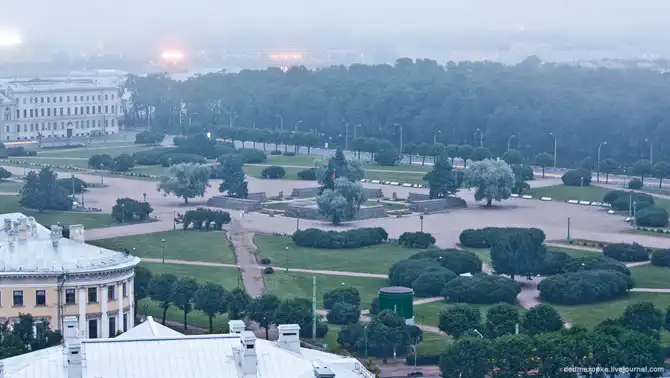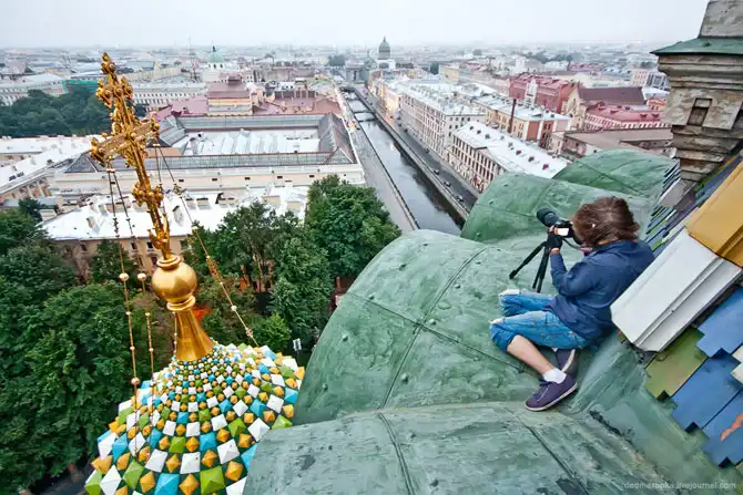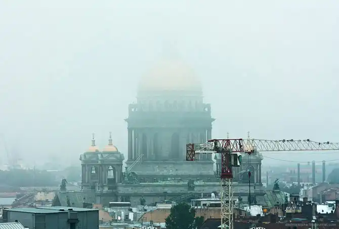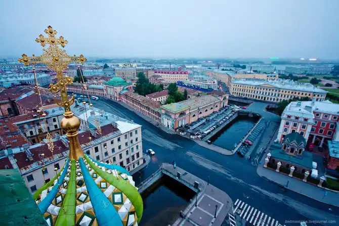 Милицейские машины, люди, камеры – ничто нас не заметило на самом залазе. Буквально по зданию мы поднялись на самый верх и стали фотографировать. Честно говоря, я был в шоке от того, как и куда мы залезли, хотя, это был даже не шок, а по большей части восторг :) Красивые виды, утренний туман и величие храма – еще одно незабываемое впечатление от моей поездки в Питер.