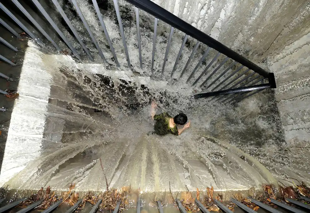 Китаец бежит по затопленному лестничному пролету в подземном гараже во время ливня в Чэнду, провинция Сычуань.