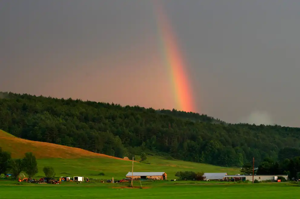 Радуга над фермой после дождя в Чарльстауне, Нью-Хэмпшир, США.