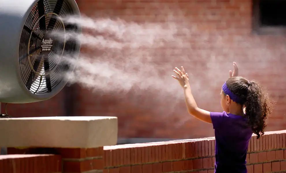 Шестилетняя Андре Ривера из Пуэрто-Рико освежается у вентилятора в Техасе.