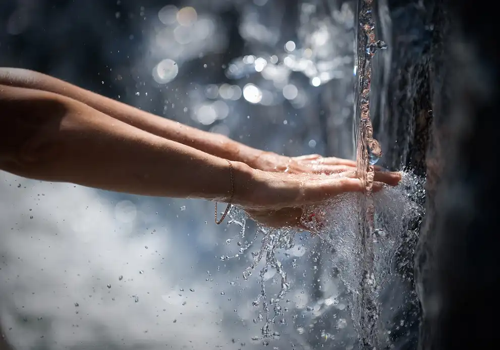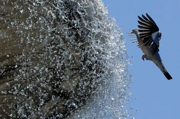 Голубь освежается у фонтана в Мадриде.