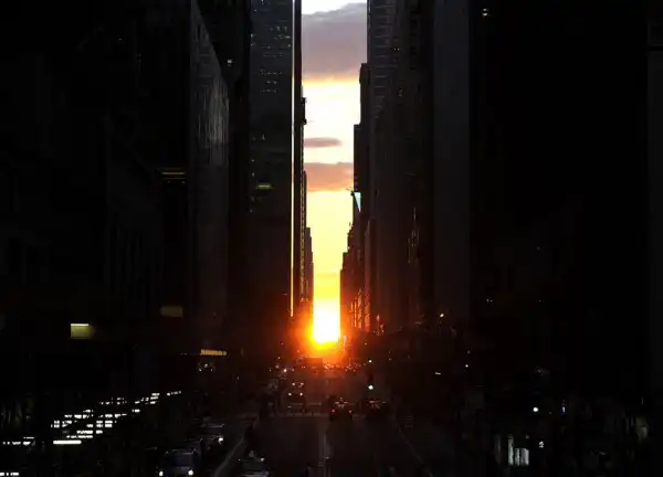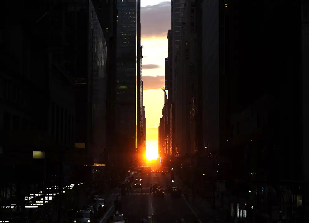 Солнце садится на горизонте между домами на улице 42-ая Стрит в Нью-Йорке. Это событие происходит дважды в год, когда солнце садится, освещая улицы сиянием с запада на восток.