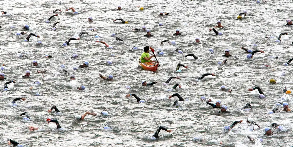 Участники Парижского триатлона в реке Сена в Париже.