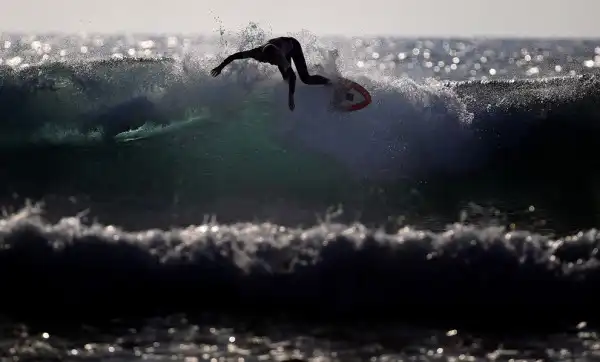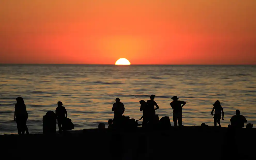 Отдыхающие на закате на пляже Мунлайт в Энсинитасе, Калифорния.