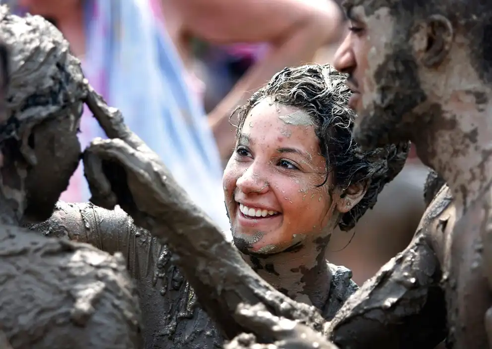 Дети играют в огромном озере грязи во время конкурса в Денб грязи в парке Нанкин Миллс в Вестленде, штат Мичиган. Более 75 тысяч литров воды смешивают с 200 тоннами грунта ради этого ежегодного события.