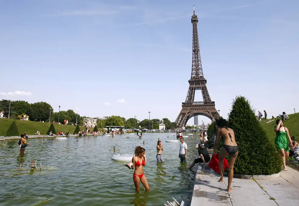 Люди освежаются в фонтанах на фоне Эйфелевой башни в Париже.