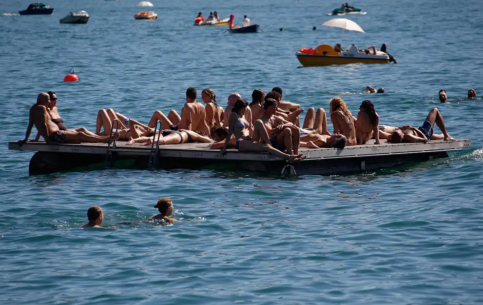 Люди на плавучей платформе в теплый летний день в Цюрихе.