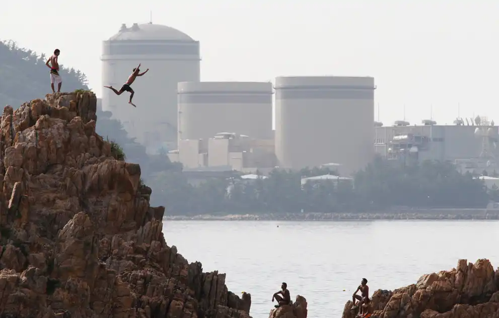 Парень прыгает в море со скалы на фоне АЭС «Kansai Electric Power Co.» в японском городе Михама.