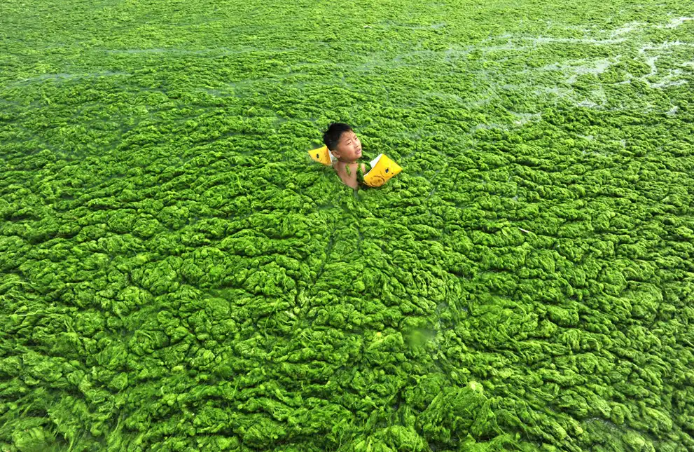 Мальчик в заполненном водорослями водоеме в Циндао, китайская провинция Шаньдун.