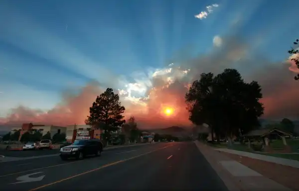 Солнце светит через облако дыма от пожара недалеко от национальной лаборатории Лос-Аламос в одноименном городе в Нью-Мексико, США. Тогда лесной пожар продолжался четыре дня, приблизившись к одной из ядерных лабораторий страны, но пожарным удалось сдержать его.