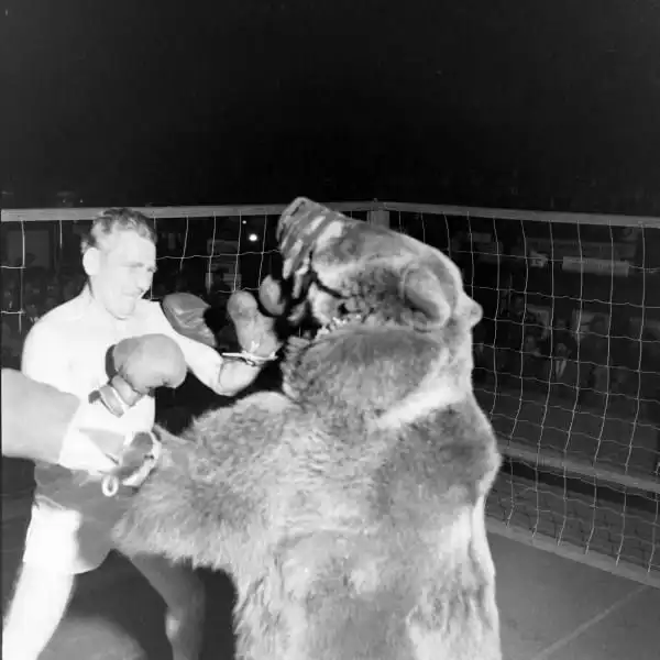 В 1949 провели матч между медведем и человеком (боксером Гусом Уольдорфом). Конечно, медведь был дрессированным, а матч постановочным, иначе боксеру не поздоровилось.