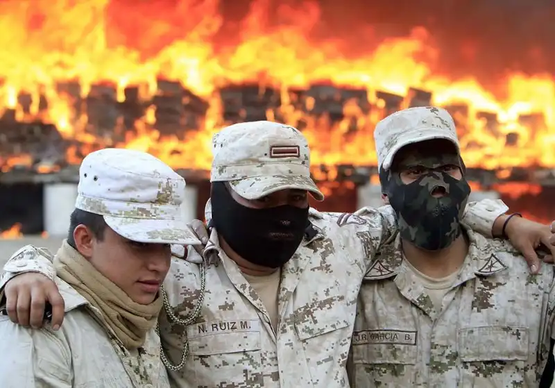 Солдаты позируют на фоне огромного костра, во время уничтожения 136 тонн марихуаны