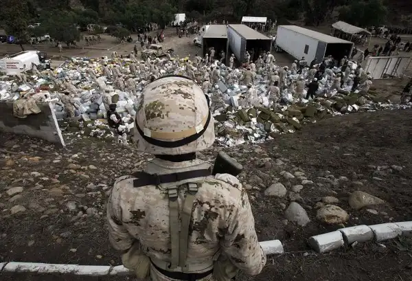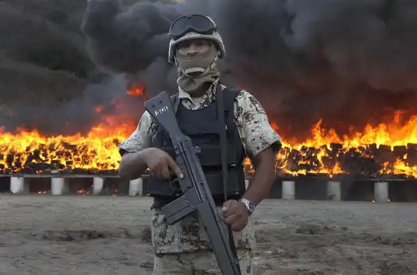 Наркокартель Синаола с 1990 года и 2008 год импортировал в Соединенные Штаты почти 200 тонн кокаина и большое количество героина. Синалоа имеет в своем подчинение около 1000 бойцов. На фото: Мексиканский военный охраняет место уничтожения наркотиков