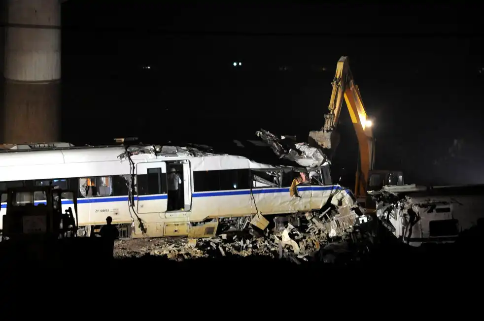 5. Китайская блогосфера была возмущена не только проблемами с обеспечением безопасности, но и тем, как правительство вело себя после трагедии. На фото: Рабочие разбирают экскаватором обломки после субботней аварии.