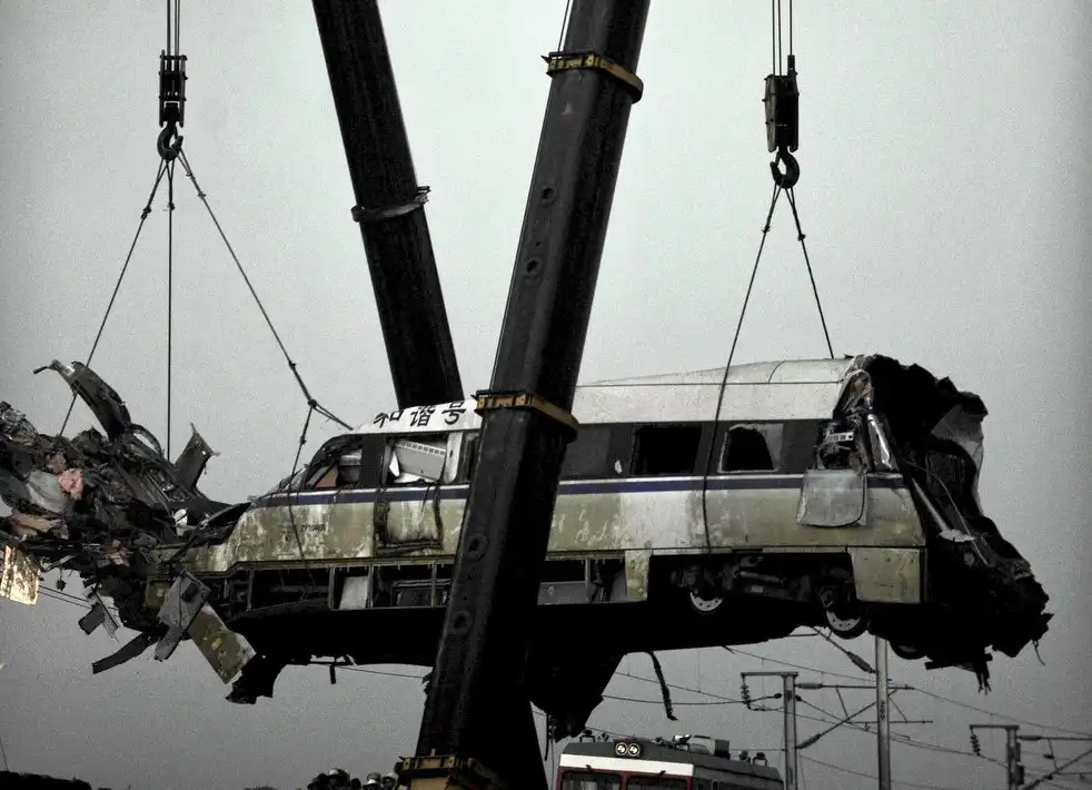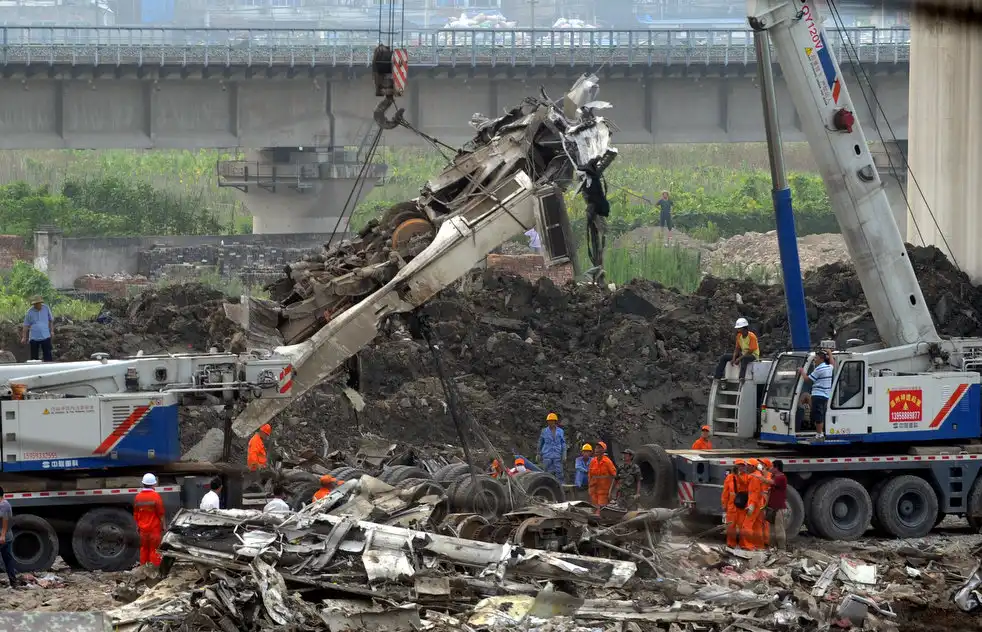 12. Обломки пассажирского поезда поднимают с моста. Правительство Китая вкладывает миллиарды долларов в строительство сети скоростных железных дорог.