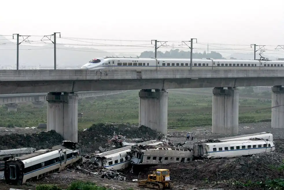 10. Ранее после аварии Global Times опубликовала статью под заголовком "Возмущение из-за отсутствия ответов на вопросы". На фото: Скоростной поезд проезжает мимо места недавней аварии в Вэньчжоу.
