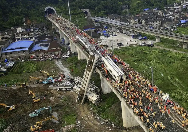 20. Многие китайские блогеры обрушились с критикой на транспортные власти. При этом многие интернет-пользователи указывают не только на пробелы в обеспечении транспортной безопасности, но и на скрытность властей в расследовании причин трагедии. На фото: Спасатели и гражданские помогают пассажирам вылезти из-под обломков поезда, упавшего с моста в результате столкновения с другим поездом.