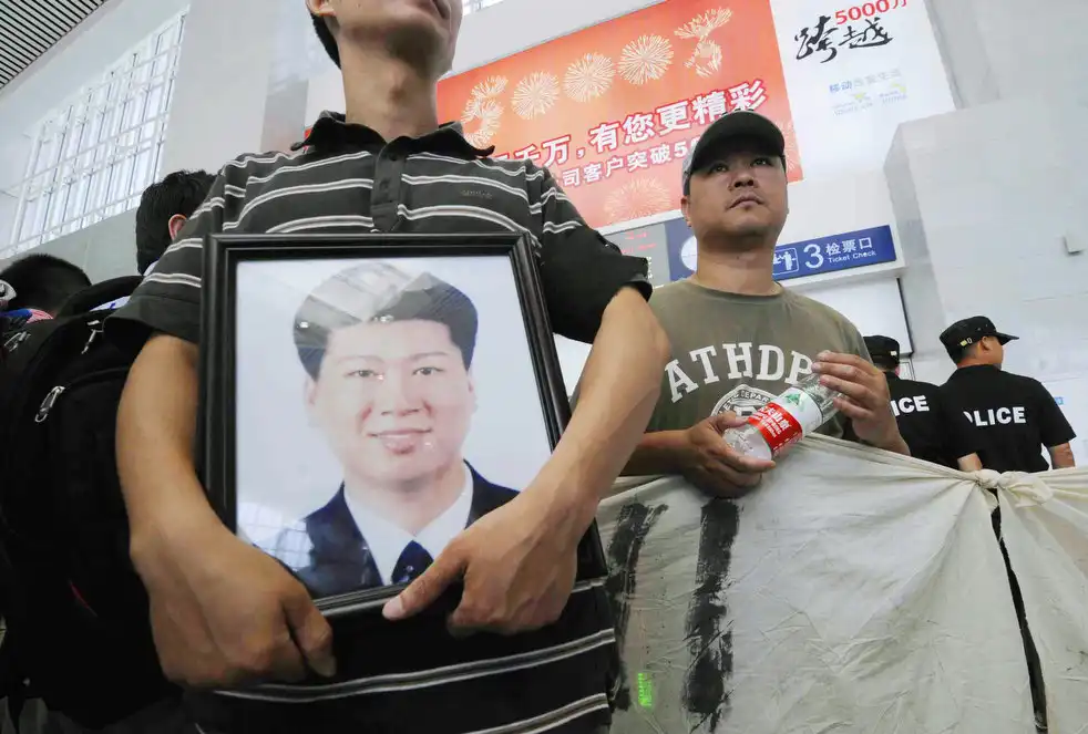 2. В среду более 100 близких и родственников жертв железнодорожной катастрофы, произошедшей в субботу вечером в восточной провинции Чжэцзян, вышли на акцию протеста на Южный вокзал г.Вэньчжоу с требованиями к правительству организовать прозрачное расследование обстоятельств крупной аварии. На фото: Родственники жертв перекрыли ворота во время акции протеста на ж/д станции Вэньчжоу.