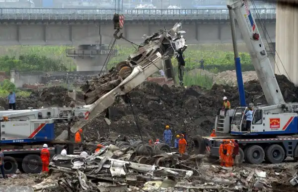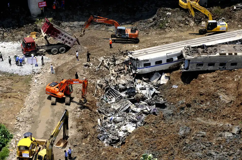 13. Рабочие на экскаваторах работают на месте аварии. В июне открылось скоростное сообщение между Пекином и Шанхаем, время пути сократилось вдвое. Однако этот проект подвергается критике. Во-первых, критики недовольны ценой строительства – строительство ветки Пекин-Шанхай обошлось в 33 миллиардов долларов. Во-вторых, вскоре после открытия ветки на ней были обнаружены технические неполадки. Линия несколько раз обесточивалась.
