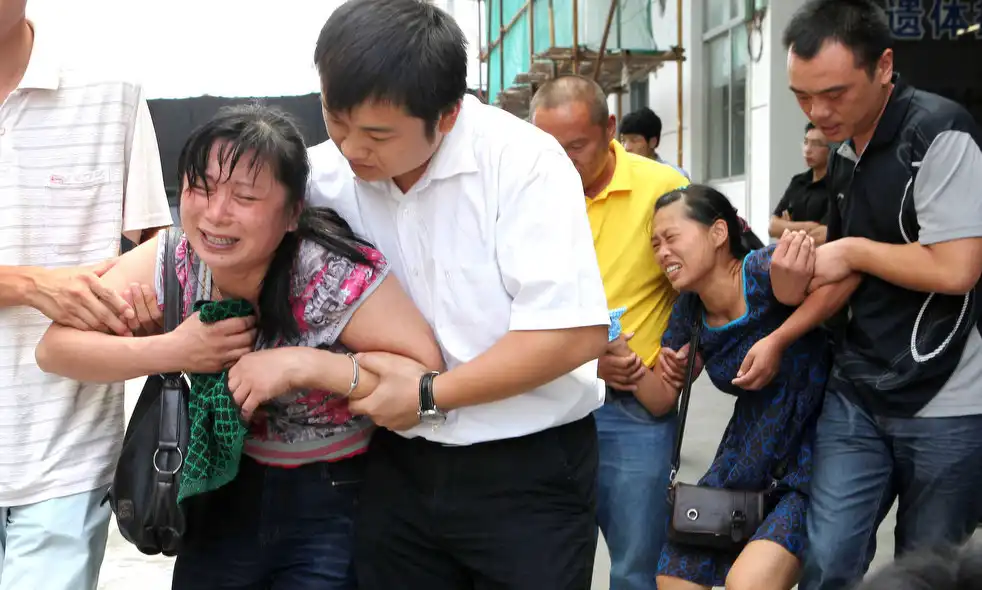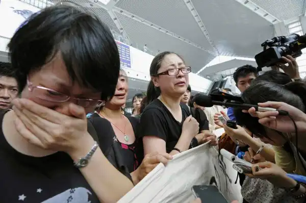 1. Родственники жертв аварии пытаются сдержать эмоции, общаясь с журналистами, во время акции протеста против невнимательного отношения правительства к трагедии, в Вэньчжоу, провинция Чжэцзян, 27 июля.