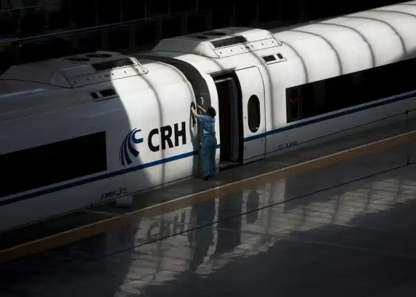 3. Рабочий моет вагоны скоростного экспресса на станции Пекин Саут в Пекине.