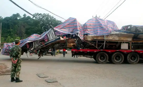7. Сообщается, что журналистам в Китае было приказано концентрировать внимание на позитивных историях на время расследования катастрофы. На фото: Грузовик с обломками поезда покидает место аварии.