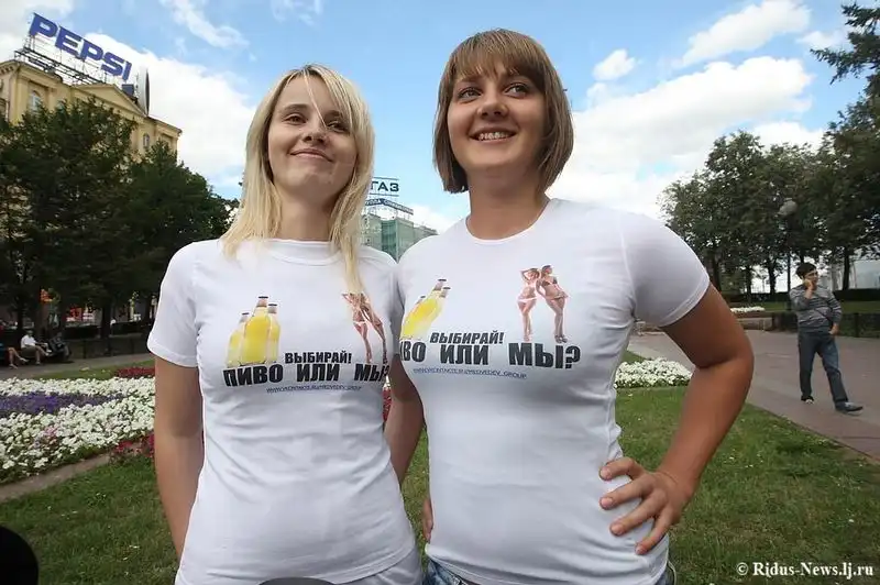 Непосредственно раздевались три поклонницы Медведева. Девушки с ведрами, на которых были соответствующие пометки, стояли в окружении журналистов. Остальные участники акции в майках "Выбирай! Пиво или мы?" ходили по Новопушкинскому скверу и агитировали распивающих пенный напиток слить его в ведра.
