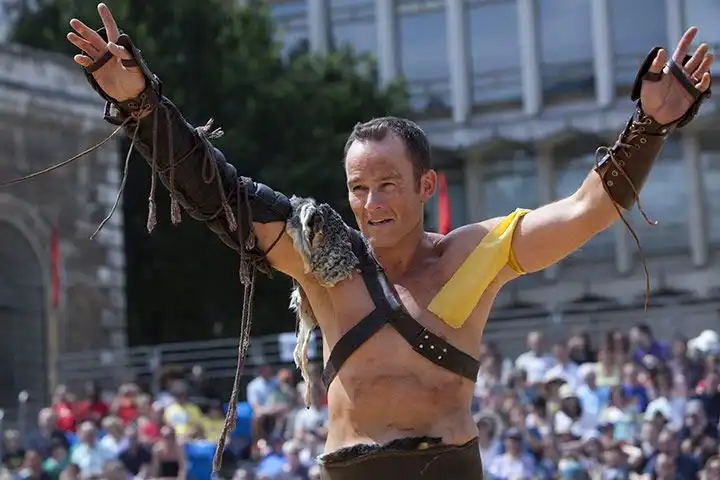 Поддельная кровь брызгает в разные стороны во время того, как гладиатор наносит смертельный удар своему противнику.
