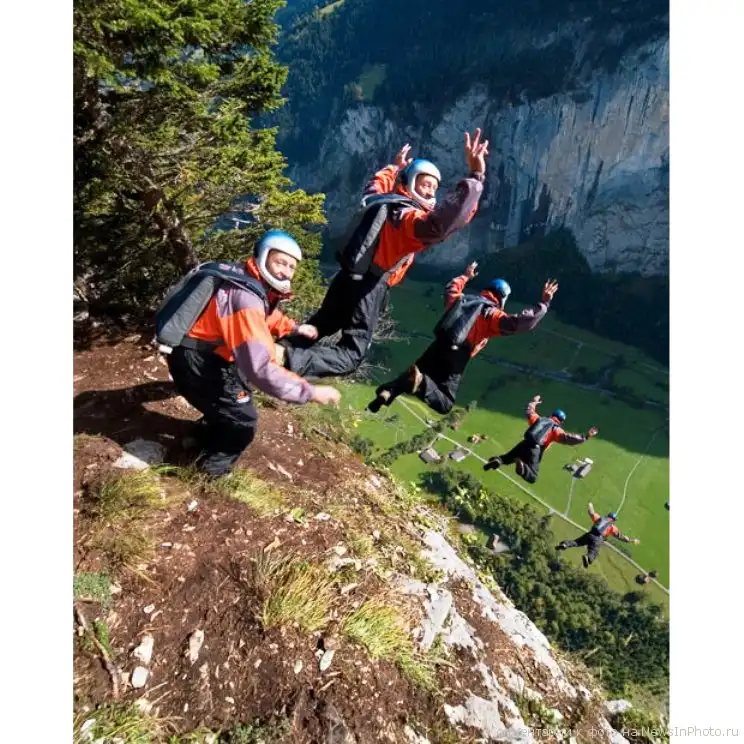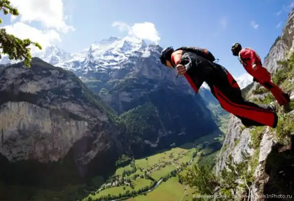 Бэйсджампер прыгает со скалы «Высокий Нос», Лаутербруннен, Швейцария.
