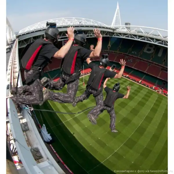Бэйсджампер прыгает с крыши стадиона «Millennium Stadium», Кардифф, Уэльс