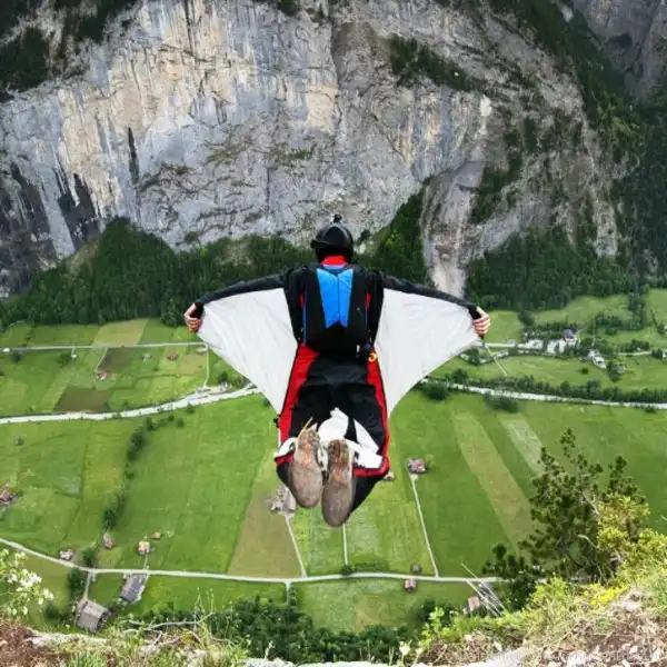 Прыжок бэйсджампера из команды ProBASE в крылатом костюме. Лаутербруннен, Швейцария.