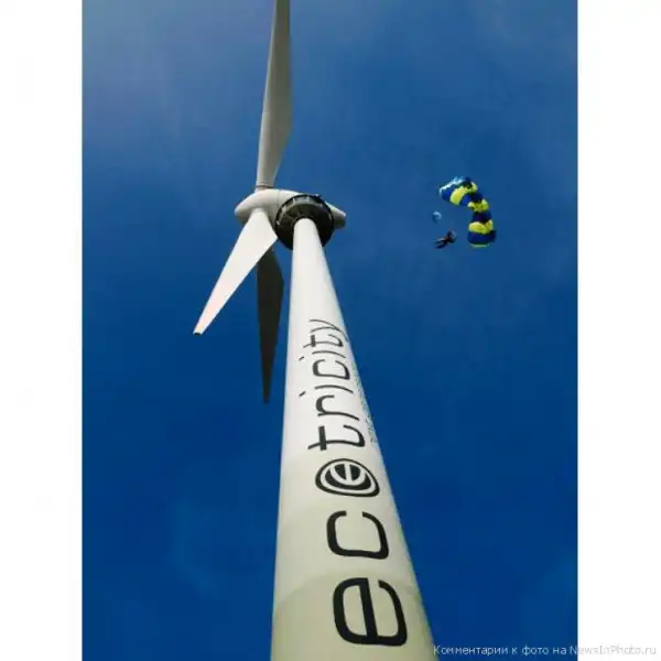 Прыжок спортсмена-бэйсджампера из команды ProBASE с ветряной турбины Ecotricity